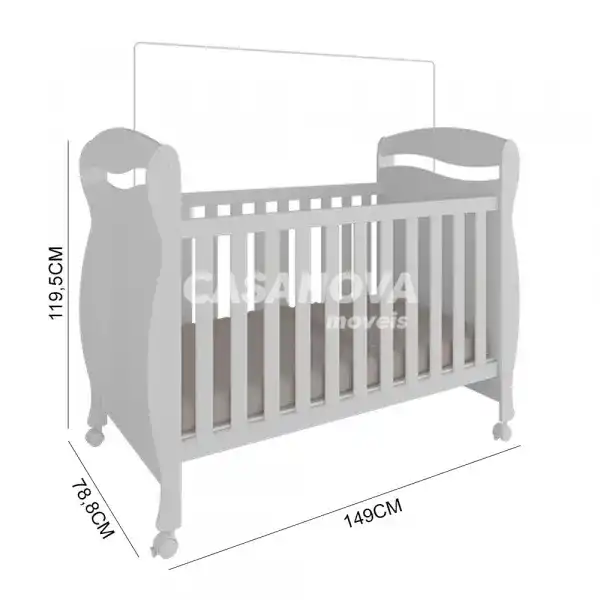 Este móvel comporta colchão de 12 cm de altura (máxima permitida); 70 cm de largura e 130 cm de comprimento. O colchão NÃO ACOMPANHA o berço.